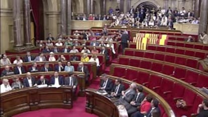 La retirada de las banderas por parte de la diputada de Podem y el abandono del Parlament por los diputados de PP, PSC y Ciudadanos no pudo verse en la retransmisión del Pleno que realizó TVE a través de su canal 24 horas en directo. Mientras todo eso ocurría en el hemiciclo, la señal de TVE mostraba un plano corto de la presidenta del Parlament, Carme Forcadell. Del mismo modo, durante la votación de las enmiendas y la aprobación de la ley, en el canal 24 horas no se vio nunca que la mitad de los escaños del hemiciclo estaban vacíos.