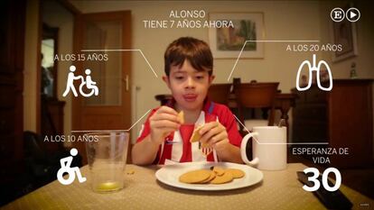 Alfonso tiene 8 años y le encanta el Atlético de Madrid y jugar al fútbol con su padre, pero dentro de poco no podrá hacerlo. Sufre Distrofia Muscular de Duchenne (DMD) y a menos que se encuentre una cura en unos años tendrá que usar silla de ruedas, a los 15 no podrá mover los brazos y a los 20 necesitará un respirador automático. La esperanza de vida media de las personas que padecen DMD es de 30 años. Este jueves se celebra el Día Mundial de la Concienciación de Duchenne, patología que afecta a 1 de 3.500 niños en el mundo.