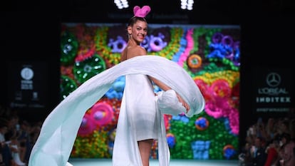 Modesto Lomba, siempre inquieto, prepara el lanzamiento de una segunda línea de precios más asequibles “para 2018”. Estará compuesta por una serie de “prendas esenciales” que, según explica el diseñador, han sido seleccionadas mediante un estudio de mercado realizado por la Universidad Francisco de Vitoria. También contará con colecciones cápsula que se presentarán cada tres meses y podrán adquirirse en ese mismo momento. Mientras este proyecto toma forma, el presidente de la Asociación de Creadores de Moda de España (ACME) ha teñido este viernes de blanco su pasarela. Con la elección de este “nocolor”, el diseñador buscaba “dejar todo el protagonismo a la arquitectura de los patrones” y, de paso, hacer un guiño a su última fragancia, Hipnotica, que da nombre a esta colección y que está elaborada con jacintos y jazmines blancos, como no podía ser de otra forma. Se trata de su segunda colaboración con la empresa perfumera española Dreamlabo, junto a la que está presente en 600 puntos de venta.
