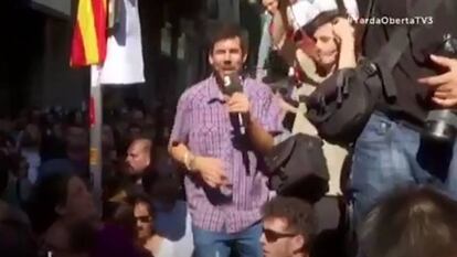 Un reportero de TV3 se sube a un coche de la Guardia Civil durante las protestas soberanistas