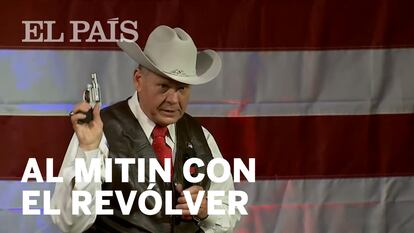 La Segunda Enmienda de la Constitución de EE UU garantiza el derecho de sus ciudadanos a portar armas. A Roy Moore, candidato en las primarias republicanas para luchar por una vacante por Alabama en el Senado, no le gustó que se pusiera en duda su defensa de este derecho. Y decidió despejar las dudas de la forma más gráfica posible: sacando un revólver durante su mitin final de campaña.