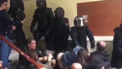 Agentes de la Policía golpean a algunas personas que hacían cordón para impedir que llegasen a la mesa electoral
