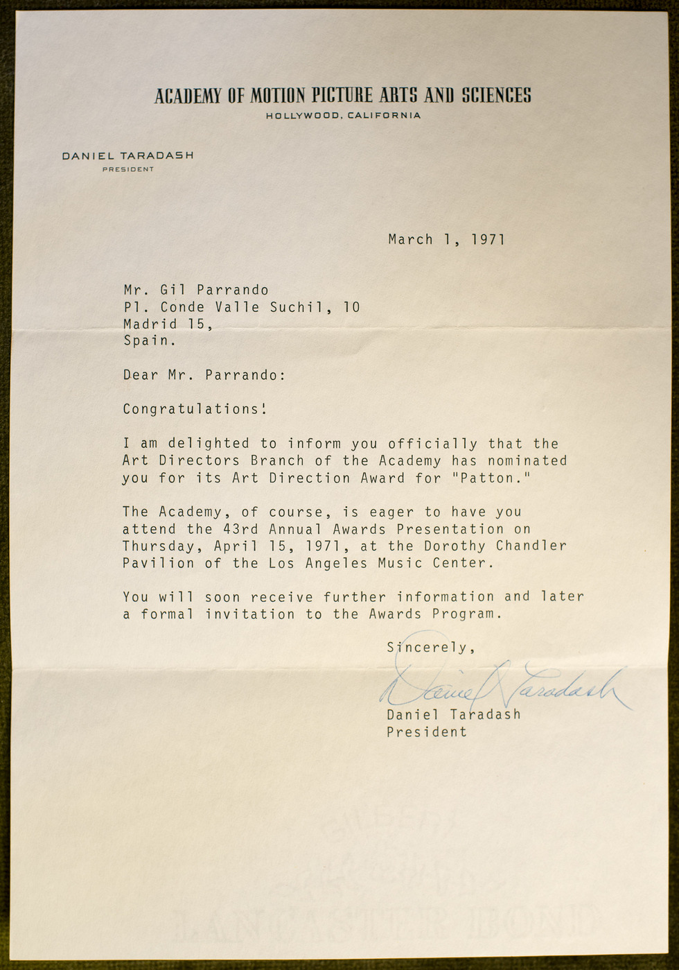 Aún queda Parrondo por ver. El 20 de octubre se estrena La piel fría, un thriller de ciencia-ficción que se desarrolla tras la Primera Guerra Mundial y supone su último diseño de producción. Algunos bocetos de esta película asoman en un cajón de su despacho. En otro aparecen las cartas de la Academia de Hollywood y un albarán expedido por las líneas aéreas TWA con Gil Parrondo como destinatario. Con fecha del 6 de mayo de 1971 registra la llegada al aeropuerto de Barajas en el vuelo 904 de una mercancía remitida desde Los Ángeles con un peso de 15 libras. Descripción: “Oscar statuette”. Con el papel en la mano, Ima dice: “Para él, el cine era soñar. Y consiguió ser parte de esa fábrica de sueños”.