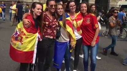 Varios jóvenes han protagonizado algunas escenas en las protestas de la huelga convocada este martes en Cataluña al combinar la bandera española con la senyera y la estelada. Uno de los vídeos que recoge estos momentos, grabado por el periodista de EL PAÍS Nacho Carretero, muestra a un grupo de chicas jóvenes con distintas enseñas y atuendos, como una camiseta de la selección española de fútbol y una bandera independentista. Otra situación muestra a un joven que portaba una bandera española atada al cuello y una pancarta que rezaba: “No quiero la independencia, pero no puedo quedarme en casa mientras golpean a mi pueblo”. Alrededor, numerosos manifestantes con la bandera independentista le aplaudieron.