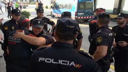 Este jueves, algunos mossos se han acercado hasta el hotel donde se alojan los policías nacionales para despedirlos con abrazos y gestos de cariño. Una imagen significativa si se tiene en cuenta las fricciones que han surgido con la policía autonómica, que mantuvo una actitud pasiva en la mayoría de los casos el pasado domingo y se limitó a levantar acta en los puntos de votación, en lugar de intervenir. Una situación que tiene divididos a los propios mossos d’Esquadra.