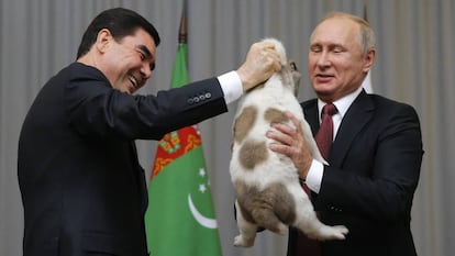 Este miércoles, durante un encuentro bilateral, el presidente de Turkmenistán eligió agasajar al líder ruso por sus 65 años recién cumplidos con un precioso cachorro de raza Alabái (perro pastor centroasiático), que Gurbanguli Berdimujamedov manejó con cierta rudeza tras sacarlo del transportín y exhibirlo ante los fotógrafos como un trofeo. Vale que lo de cargar por el pellejo va en los genes y en la rutina del acarreamiento de las crías, pero el gesto fue mejorable.