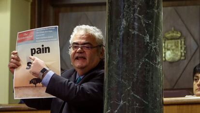 El diputado del PDeCAT Feliu-Joan Guillaumes ha exhibido este miércoles en el pleno del Congreso de los Diputados una portada de The Economist, de junio de 2012, como si fuera la que el semanario británico publicó tras el referéndum independentista del pasado 1 de octubre para ilustrar la reacción de la prensa internacional ante lo que ocurrió ese día. La imagen juega con la palabra “Spain”, España en inglés, y deja caer la letra “s” de manera que se lee “pain”, que significa dolor.