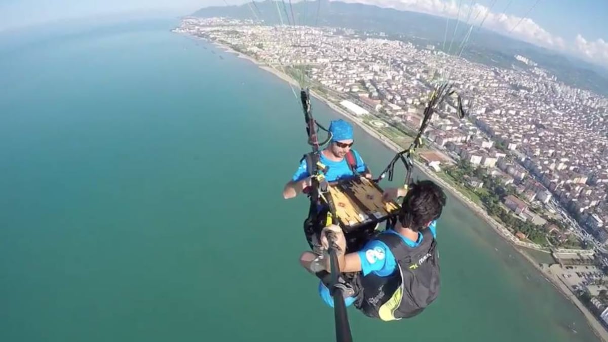 Dos paracaidistas han llevado a cabo una peripecia en el aire. Los dos individuos han aprovechado el descenso para jugar una partida al backgammon y tomar un aperitivo mientras sobrevolaban el Mar Negro, antes de aterrizar en Ordu, Turquía. Lo han conseguido fijando una mesa de pequeñas dimensiones a los arneses del paracaídas.