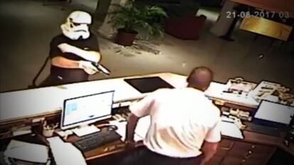 La Guardia Civil de Mijas, en Málaga, detuvo el pasado lunes al supuesto autor de un rocambolesco atraco, en el marco de la operación Vader 2017. El hombre, un británico de 41 años, se presentó el pasado mes de agosto en un hotel del municipio malagueño con una máscara de soldado imperial, uno de los personajes de la saga Star Wars. Lo curioso del robo no acaba en el disfraz del atracador, sino en cómo sucedieron los hechos. La cámara de seguridad recogió cómo guardó el botín de 1.500 euros con torpeza porque la máscara apenas le dejaba ver, cómo se la volvía a colocar con el arma y cómo llegó a preguntar al recepcionista por dónde marcharse, después de equivocarse de dirección. Los agentes identificaron a la misma persona como autor de otro robo cometido dos horas antes, pero en ese caso vestido con un chaleco con la inscripción "Interpol". La propia Guardia Civil ha bromeado con los hechos en su perfil de Twitter.