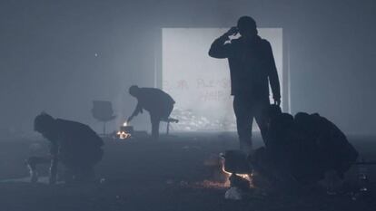Desde el primer momento intuyo que ese humo negro va a ser el primer plano del documental. Es terrorífico, nauseabundo, irrespirable y denso. Lo ocupa todo. Proviene de las maderas que la gente quema para calentarse, y estas pertenecen a la antigua vía de tren de la estación abandonada. Los tablones están barnizados con un material tóxico que, al quemarse, produce un humo negro parecido al que sale de un neumático cuando lo prendes. No sabría cómo explicar hasta qué punto el olor de ese humo se le queda a uno clavado en la memoria. No te lo puedes quitar de encima. No hay manera de huir de él.