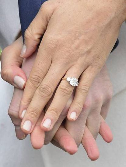 "Supe que era ella desde el primer momento en que nos vimos", ha dicho el príncipe este lunes, posando para la prensa junto a su futura esposa en los jardines del palacio de Kensington. Los futuros cónyuges —él con traje y corbata azules, ella con estiloso abrigo blanco— han posado sonrientes y agarrados de la mano. La de ella exhibía el flamante anillo de compromiso, diseñado por el propio Enrique, compuesto por dos diamantes de la colección personal de su difunta madre y uno central procedente de Botsuana, país africano donde la pareja ha pasado tiempo en su año y medio de noviazgo.