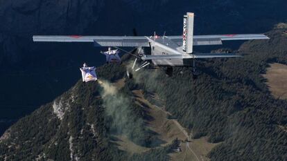Dos hombres pájaro han conseguido completar una complicada proeza. Los saltadores franceses de wingsuit Fred Fugen y Vince Reffet se arrojaron al vacío desde una cumbre nevada y extendieron sus alas. Durante un minuto coordinaron su trayectoria con la de una avioneta que aparece a su lado y en cuestión de segundos, se colocaron para el gran reto: colarse por una puerta de un metro y medio de ancho. Y lo consiguieron. Queda registrado en un espectacular vídeo con las cumbres suizas nevadas como escenario. "Un sueño hecho realidad", afirma Vince Reffet en su cuenta de Instagram. Le dedicó esta proeza a Patrick de Gayardon, deportista que consiguió en 1997 volver a la misma avioneta desde la que había saltado y que murió el año siguiente en otra arriesgada exhibición, en Hawai.