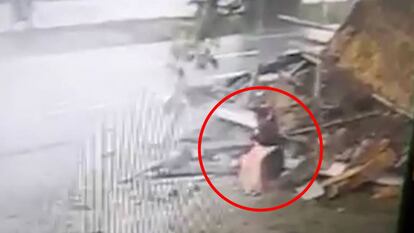 Una mujer está sentada en un refugio de madera en Chulabhorn (Tailandia). La quietud de esta imagen contrasta con la crudeza de la siguiente: un coche aparece de la nada, destroza el refugio y atropella a la ciudadana. Sorprendentemente, apenas unos segundos después del accidente, la mujer aparta los escombros, se levanta, y se marcha del lugar con la mano en la espalda como única muestra de dolor. Aunque tanto ella como el conductor solo tuvieran heridas leves, ambos fueron trasladados al hospital.