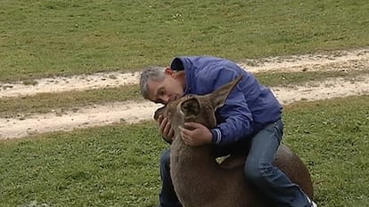 Aladino Montes, de 53 años, encontró a 'Bambi' en 2013, cuando era una cría moribunda llena de heridas. Fue entonces cuando comenzó la amistad entre este asturiano y la cierva, a la que acogió, alimentó y cuidó. Ahora se han hecho inseparables. "Ya es mi hijita. Damos paseos muy largos, un día marchamos de aquí a las cuatro de la tarde y llegamos a la una de la mañana", cuenta. Aunque Bambi vive en libertad, acude con frecuencia a los alrededores del bar que regenta Montes en Les Praeres, en Nava (Asturias). Montes acaricia, besa y abraza a Bambi sin problema, algo sorprendente teniendo en cuenta que estos animales no se acercan tanto a los humanos. Esta estrecha relación, "más que una amistad", ha cambiado por completo la forma de pensar de Montes, que antes era cazador y ha dejado de serlo. "Ahora ni se me pasa por la cabeza. Ni aunque me pagues ahora mato un bicho", manifiesta con lágrimas en los ojos.