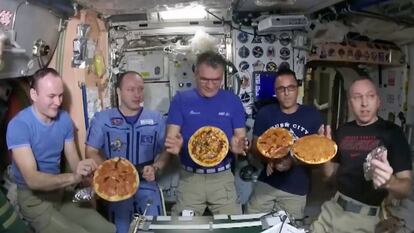 Sábado noche, pizza y película. Lo que para muchos es rutina, el pasado 18 de noviembre se convirtió en algo excepcional. No todos los días se organiza un pequeño banquete en torno al internacional plato italiano en el espacio. Es lo que hicieron los astronautas de la Estación Espacial Internacional tras recibir todos los ingredientes en unos paquetes especiales que iban entre la carga de un envío ordinario de más de 3.000 kilos de materiales. Tal y como muestra un vídeo difundido por la NASA, añadir a una masa salsa de tomate, queso, pepperoni, aceitunas, aceite de oliva, anchoas o peso se convierte en una aventura cuando no hay gravedad. Aunque entre los comensales había todo un experto, el astronauta italiano de la Agencia Europea del Espacio (ESA, por sus siglas en inglés) Paolo Nespoli, quien aseguró que el resultado fue sorprendentemente sabroso.