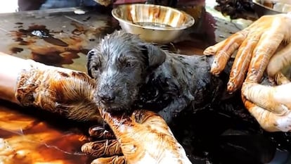 Tres cachorros en un charco de alquitrán que empezaba a solidificarse. No está claro cómo llegaron hasta allí, pero sí que estaban a punto de perder la vida. Por suerte el rescate llegó a tiempo. Un vídeo de la organización animalista Animal Aid Unlimited en India permite ver cómo fue todo el proceso. Las imágenes muestran el angustioso momento en que las crías fueron sacadas del alquitrán que ya formaba prácticamente un bloque alrededor de su cuerpo. También los baños y masajes con aceite que, durante tres días, permitieron liberar a los animales de la pegajosa sustancia. Y el final más feliz posible: los rescatadores encontraron en esos días a la madre de los cachorros, así que también hubo un reencuentro familiar. El emotivo vídeo fue compartido en Youtube el pasado 25 de noviembre y se ha convertido en un éxito con más de un millón y medio de visualizaciones.