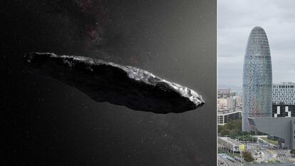 Bannister y sus colegas calculan hoy en la revista Nature Astronomy que Oumuamua es un cilindro de unos 200 metros de largo por 40 de ancho. Un auténtico pepino. “Sabemos más de su forma que de su tamaño, porque lo que podemos medir son las variaciones de su brillo a lo largo del tiempo” a causa de la rotación, expone la astrónoma, de de la Universidad de la Reina de Belfast, en Reino Unido. “Todo lo que podemos decir por ahora es que los cambios en su brillo durante aproximadamente ocho horas implican que su forma es alargada, con las mismas proporciones que la Torre Agbar”, añade. El edificio barcelonés mide 144 metros de altura.