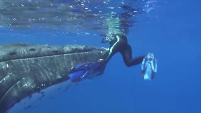 Una ballena protege a una buceadora de un tiburón en el Pacífico