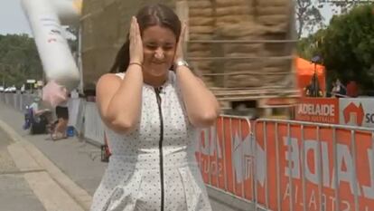Una cadena de televisión australiana captó un momento anecdótico que se vivió durante una carrera ciclista femenina en Australia. Un camión que seguía a las deportistas arrastró la línea de meta: un gran arco hinchable que las ciclistas debían cruzar. La reportera de teleivisón Sarah Hancock estaba en ese momento haciendo pruebas ante una cámara y se tapó los oídos ante el ruido sordo que estaba provocando el vehículo. Al girarse, descubrió lo que estaba ocurriendo. El camión paró pasados unas decenas de metros y los organizadores pudieron recuperar y volver a instalar la estructura hinchable.