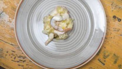 4. Secar las patatas y cortarlas en dados. Añadir la mayonesa y las colas de las gambas. Dejar enfriar y servir.