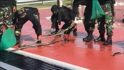 Serpientes vivas, entre ellas una cobra participan en la exhibición militar de soldados indonesios, en honor a un destacado espectador, nada menos que el secretario de Defensa de los Estados Unidos. Jim Mattis, de visita en Indonesia, ha presenciado cómo estos soldados están entrenados para andar sobre fuego ó para partir bloques de piedra. Una singular exhibición que terminó con un simulacro más rutinario, el de secuestro y liberación de rehenes.