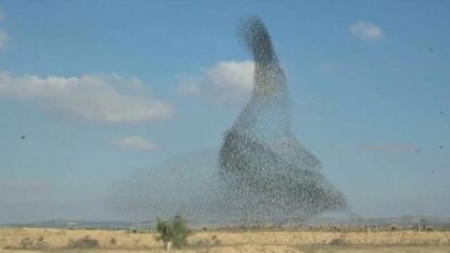 Una bandada de pájaros, concretamente de estornios, han sobrevolado la ciudad de Rahat (Israel) dejando tras de sí una curiosa imagen. Las aves, procedentes de Rusia y del este de Europa, fueron creando figuras en movimiento gracias a la sincronización de sus vuelos y la densidad de sus cuerpos. Los expertos creen que estos cambios de forma en el grupo se hacen para despistar a los depredadores y que con ellos los estorninos buscan también seguridad ante el ataque de halcones y otras especies voladoras. Por razones que se desconocen, los estorninos que antes visitaban esta misma zona por millones, ahora apenas alcanzan los cientos de miles.