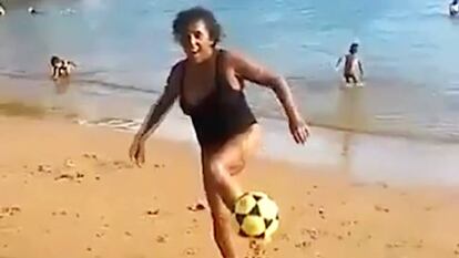 La destreza con el balón de una mujer en una playa de Brasil está cautivando a los amantes del fútbol de todo el mundo. La señora, de edad desconocida, realiza un ejercicio de toques con el que bien podría participar en una competición futbolística de 'freestyle'. Los turistas presentes en la playa quedaron tan asombrados, que uno de ellos decidió compartirlo en Twitter, lugar en el que han bautizado a esta mujer como 'La abuela de Ronaldinho'. Las redes sociales han homenajeado de esta forma también al 'crack' brasileño, que ha anunciado su retirada a los 37 años.