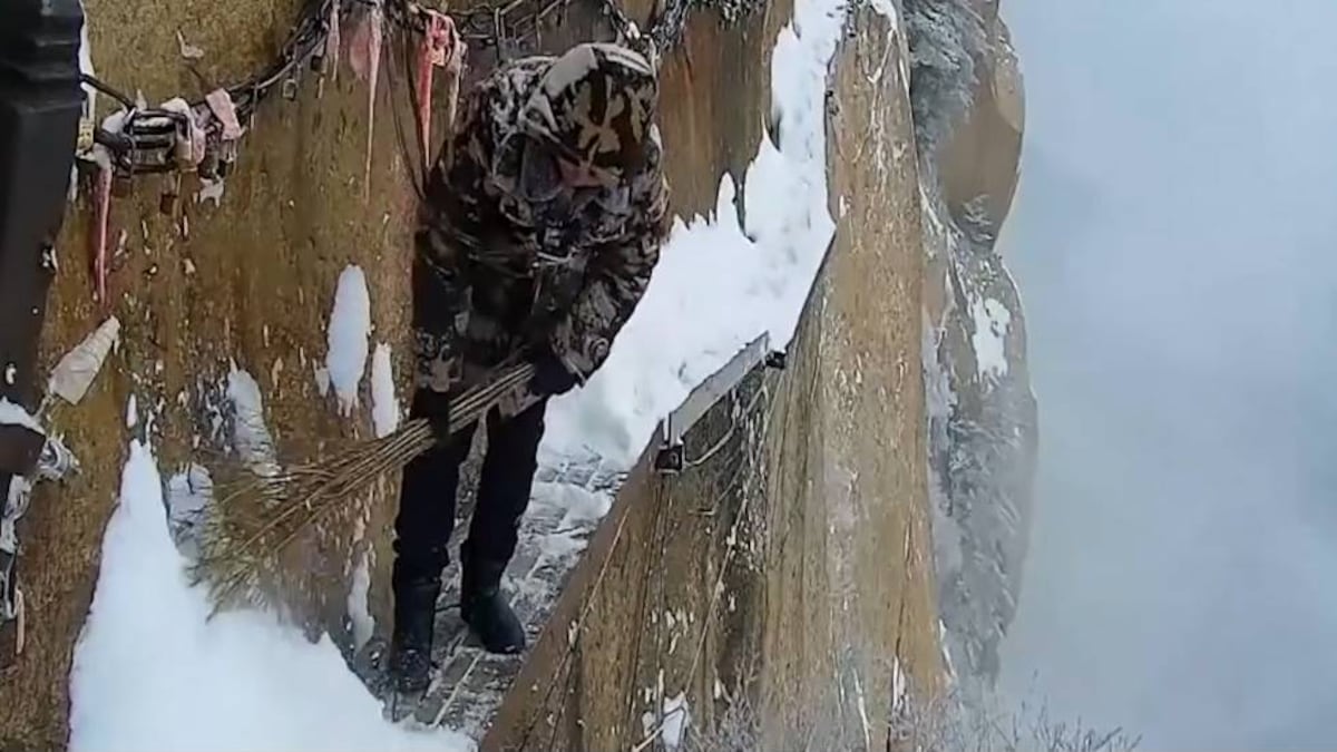 Zhang Dongdong es un joven de 26 años con una profesión no apta para gente con miedo a las alturas: quita la nieve de un sendero transitable de apenas 30 centímetros de ancho a una altura de 2.000 metros en el Monte Hua. Situado en la provincia china de Shaanxi, es uno de los cinco montes considerados sagrados por el taoísmo. Ataviado con poco más que un gorro, unas orejeras y palas y escobas, el protagonista de este vídeo trabaja para limpiar un desfiladero de 100 metros de largo que visitan miles de turistas al año.