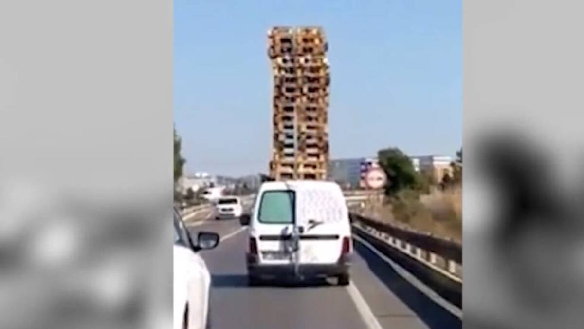 La Guardia Civil ha denunciado por conducción temeraria al titular de un vehículo que circulaba con 15 palés sobre el techo de la furgoneta en la carretera N-220 --desde el Aeropuerto de Manises hacia Paterna (Valencia)-- que ahora se enfrenta a una sanción de 500 euros y 6 puntos del permiso de conducir. Asimismo, puede ser multado con 200 euros más, ya que no estaba al día de la correspondiente Inspección Técnica de Vehículos (ITV). El Instituto Armado tuvo este martes conocimiento de la publicación de un vídeo en las redes sociales, en el que se observa una furgoneta que circula a velocidad anormalmente reducida, llevando sobre el techo una quincena de palés colocados verticalmente, superando los cinco metros lo que supone "un peligro para la seguridad vial". Por ello el Grupo de Investigación y Análisis (GIAT) del Sector de Tráfico de la Guardia Civil de Valencia, en colaboración con el Subsector de Tráfico de la Guardia Civil de Valencia, llevó a cabo un estudio de las imágenes y averiguó que los hechos ocurrieron el pasado día 29 de enero de 2018 en la carretera N- 220 que va desde el Aeropuerto de Manises a Paterna.