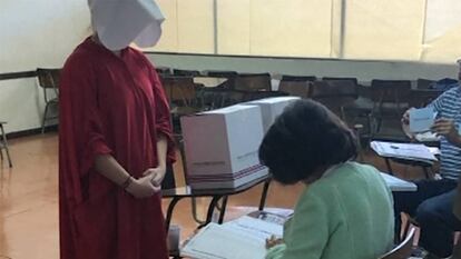 Dos mujeres vestidas de rojo y con tocas blancas que tapan su rostro y reducen su campo de visión caminan a la par mirando al suelo. La escena no se produce en la república de Gilead, sucesora de Estados Unidos en la distopía feminista de ‘El cuento de la criada’, sino en Heredia (Costa Rica), donde un grupo de mujeres aprovechó las elecciones presidenciales para visibilizar así la reivindicación de sus derechos y la lucha por la igualdad.