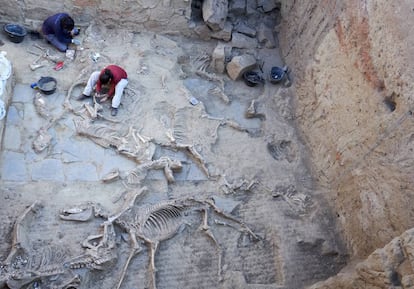 “Faltan muchos análisis que hacer y mucho edificio por desenterrar —apenas se ha excavado el 10%—”, advierten Sebastián Celestino y Esther Rodríguez, arqueólogos del Consejo Superior de Investigaciones Científicas (CSIC) y responsables del yacimiento de las Casas del Turuñuelo de Guareña, que empezó a excavarse en 2015. Pero los huesos de 22 caballos, 3 vacas, 2 cerdos, 2 ovejas y 1 asno sacrificados (eso de momento, puede haber más) no solo representan un hallazgo extraordinario —es la mayor hecatombe de animales localizada hasta ahora en todo el Mediterráneo, la primera de tamaño comparable a los holocaustos religiosos que se describen en el Antiguo Testamento o en la Iliada y la Odisea—, sino que abren nuevas pistas para entender qué pasó allí.