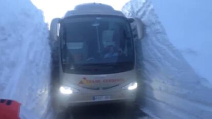 La maniobra de un autobús para pasar entre dos muros de nieve de cuatro metros