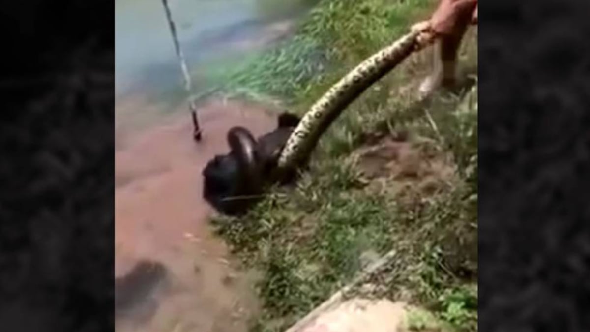Es una de las serpientes más largas, pesadas y fuertes. Capaz de estrangular y devorar a grandes víctimas, aunque la protagonista de este vídeo no salió bien parada. Se trata de una anaconda que había atrapado a un perro en la orilla de un río en Brasil. Dos hombres se dieron cuenta y acudieron al rescate del can. Primero, sacando a estirones al animal del agua, lo que permite ver si considerable longitud. Pese a tirar con fuerza de la cola de la serpiente y del perro simultáneamente, sus esfuerzos para liberar a la mascota no daban sus frutos. Hasta que uno de ellos cogió un palo y golpeó con fuerza el lomo del reptil. Misión conseguida: el perro logró zafarse. La acción fue grabada por una tercera persona (en las imágenes se escucha una voz aparentemente femenina) y las imágenes han dado la vuelta al mundo en webs y redes sociales.