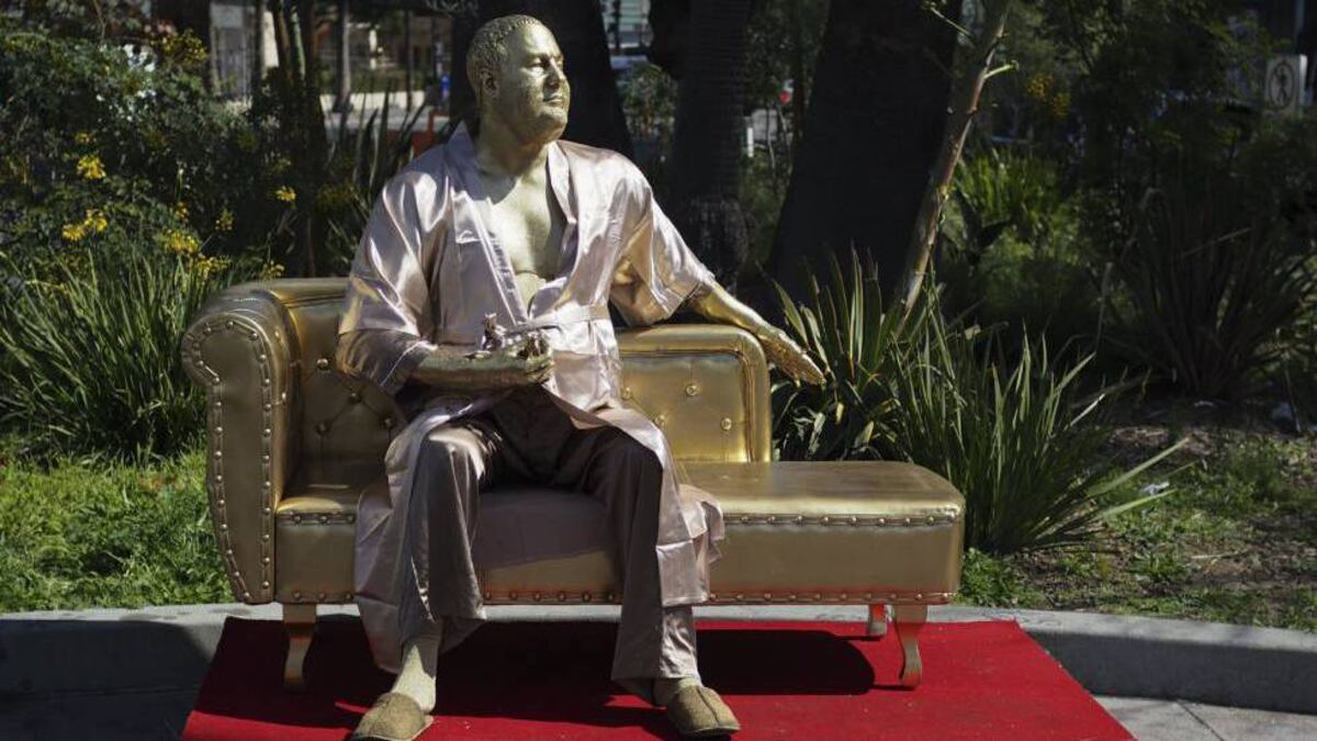 La obra, esculpida por Plastic Jesus y Joshua 'Ginger', muestra al productor vestido con una bata y sentado en un sofá