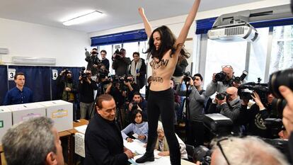 En Italia se celebran este domingo elecciones generales. El exprimer ministro italiano, Silvio Berlusconi, se disponía a depositar su voto en la urna cuando una activista de Femen se ha subido a la mesa electoral lanzando consignas y con el pecho desnudo. Il Cavaliere se ha dado la vuelta y ha esperado hasta que la activista fuera desalojada del colegio para volver a votar, esta vez con éxito.