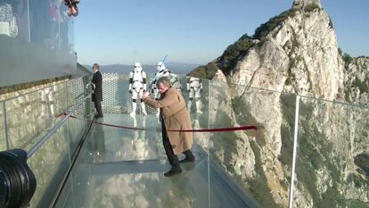 El famoso actor de Star Wars utilizó su icónica espada láser para cortar simbólicamente la cinta de un mirador que tiene como principal característica la de ser casi invisible. Las paredes son transparentes y, el suelo, traslúcido. Los pasillos miden 2,5 metros de ancho y están sujeto por 30.000 kilos de acero. Sus paneles de cristal están formados por cuatro capas de cristal de alta resistencia. El estudio madrileño MAYICE ha sido el encargado del diseño junto con Jonas Stahl, del equipo Arc Design de Gibraltar. El mirador está preparado para soportar el peso equivalente a cinco elefantes u once vehículos y es capaz de resistir rachas de viento de hasta 150 kilómetros por hora.