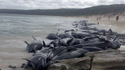 Más de 150 ballenas piloto -conocidas también como calderón tropical- han muerto tras haber quedado varadas en una playa al oeste de Australia. Solo seis de ellas han podido ser devueltas al mar y han sobrevivido gracias a los esfuerzos por parte de las autoridades y de la población local por salvarlas.