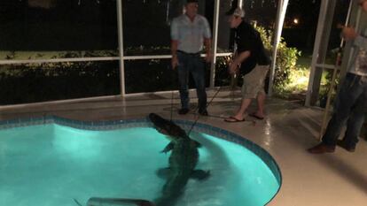 Una familia de Sarasota, en Florida, se llevó el susto de su vida este viernes por la noche cuando, tras escuchar un ruido en el exterior de su vivienda, se asomaron a la ventana y descubrieron a un cocodrilo de casi tres metros y medio nadando en su piscina. Según ha contado Patricia Carver a la cadena local News Channel 8, al mover la cortina y mirar a través del cristal, su marido vio la cabeza del animal y solo alcanzó a decir: "¡Llama al 911! ¡Llama al 911!".