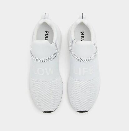 Desde los tiempos del 'Cuadrado blanco sobre fondo blanco', del pintor abstracto Malevich, el blanco sobre blanco es un juego que asegura elegancia y un punto de elocuencia. En Pull & Bear lo han aplicado a unas zapatillas deportivas en las que el blanco impoluto se rompe únicamente en ciertos toques negros en los cordones y en la trabilla trasera. La protagonista absoluto de las zapatillas, sin embargo, es una tira blanca en el empeine en la que se puede leer LOW en un pie y LIFE en el otro (las dos palabras juntas, 'low life', se pueden traducir por 'mala vida') . ¿Quién es capaz de decir que no a unos días de vida canalla? Pincha aquí para hacerte con ellas.