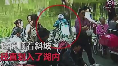 La cámara grababa un encuentro de personas mayores en el parque Yangpu de Shanghái (China) y de forma inesperada captó un incidente que pudo haber acabado en algo peor que el susto en que quedó. La cuidadora de una anciana de 90 años soltó la silla de ruedas de la mujer y le dio la espalda para contemplar cómo bailaban algunos de los asistentes. Y ni ella ni ningún otro de los presentes se dio cuenta de que la silla rodaba por una ligera pendiente hasta caer al estanque del parque.