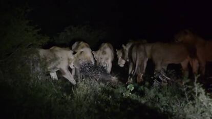 Hasta siete leones rodearon a un puercoespín en el Parque Nacional Kruger, situado en el noreste de Sudáfrica. Hernie Bekker, el director del Parque, fue quien grabó el momento del encuentro durante una excursión nocturna. La manada, toda de leones macho, se acerca al animal e intenta morderlo o darle un zarpazo en varias ocasiones. Pero el puercoespín se defiende con sus púas y logra que no le hinquen el diente, entre murmullos de admiración de los espectadores de la insólita escena. Bekker ha asegurado que nunca había visto nada igual y el vídeo que compartió en Youtube acumula ya miles de visualizaciones.
