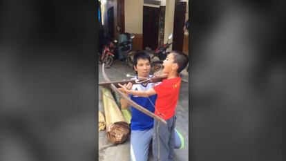 Un niño se saca un diente de leche con una ballesta en Vietnam