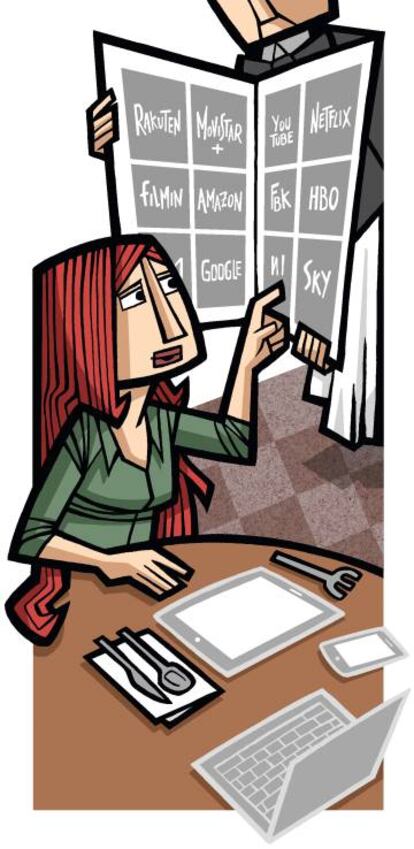 Según el último panel de hogares de la Comisión Nacional de los Mercados y la Competencia (CNMC), correspondiente al primer semestre de 2017, 4 de cada 10 españoles ven contenidos audiovisuales online al menos una vez a la semana, y lo hacen sobre todo a través de plataformas de vídeo a la carta gratuitas, como YouTube o las de los canales tradicionales, y de pago. Mientras que Movistar +, el servicio de televisión online de Telefónica, se mantiene como el que más usuarios suma según este medidor (2.007.000), destaca la fuerza con la que han entrado en el sector los internacionales Netflix —en seis meses duplicó su presencia, llegando a 1.163.000 hogares usuarios— o HBO —en sus primeros seis meses de actividad ya acumulaba 414.000 suscriptores—. No son los únicos. Amazon, Sky, Rakuten o Filmin también ofrecen contenido televisivo bajo demanda. El último informe anual de la consultora Barlovento Comunicación destacaba el sobresaliente incremento de los suscriptores a los servicios de televisión a la carta en España en 2017. Un 22,5% de los hogares con acceso a Internet ya está abonado a alguno de ellos, mientras que seis meses antes ese porcentaje era del 12%.