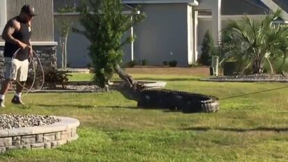Un miembro de la Florida Fish and Wildlife Comission (FCW) tuvo que emplearse a fondo durante 20 minutos este sábado para atrapar al caimán que se adentró en la zona residencial The Villages, en el Condado de Sumter, en Florida (Estados Unidos). Unos vecinos del barrio alertaron de la presencia del peligroso reptil frente al porche delantero de una casa, cuyo dueño no se encontraba allí en ese momento. El macho medía más de 3 metros y rondaba los 300 kilogramos de peso y, una vez retenido, fue trasladado a una reserva para caimanes. La Florida Fish and Wildlife Comission cree que el ejemplar estaba buscando una hembra, ya que la época de apareamiento se corresponde con los meses de mayo y junio.