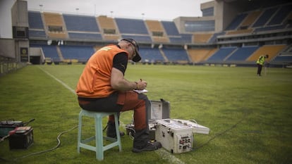 Justo en eso centra su trabajo Antonio Serrano, hidrogeólogo de la empresa Ingeagua, contratada por Aguas de Cádiz para explorar el subsuelo de la ciudad. Desde el pasado 24 de abril y durante algo más de una semana el experto, acompañado de un geofísico, ha realizado sondeos electromagnéticos en el dominio tiempo (SEDT) en 30 espacios de la ciudad. En zonas amplias como plazas, solares o playas y hasta el estadio de fútbol de la ciudad, el Ramón de Carranza, han trazado con cables cuadrados de 50x50 metros, ante la atenta mirada de decenas de curiosos.