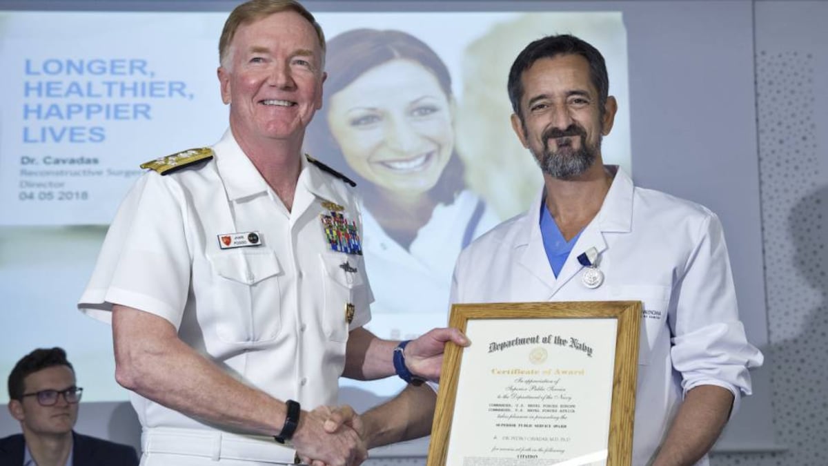 El doctor español Pedro Cavadas ha reimplantado con éxito la mano derecha a un marine de la Armada de Estados Unidos que sufrió la amputación del miembro en marzo, cuando se encontraba a bordo de un submarino de la VI Flota a 70 millas, unos 129 kilómetros, de la costa de Murcia. El comandante de las fuerzas navales norteamericanas en Europa, el almirante James Foggo, le ha condecorado este viernes por su "milagrosa" intervención en el Hospital de Manises (Valencia). Cavadas, que ha realizado varios transplantes espectaculares, algunos con repercusión mundial, ha dicho que operar al soldado tuvo la dificultad del tiempo transcurrido desde la amputación.