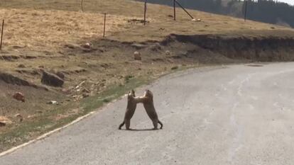 Una marmota macho corteja a una hembra más pequeña. Pero cuando están en el idílico momento, un rival se acerca a la pareja e interrumpe su momento. Es entonces cuando ambos machos comienzan un combate en mitad de una carretera en un pueblo en la montaña en la provincia Gansu, al noroeste de China. En un vídeo del enfrentamiento, se aprecia como ambos ejemplares se levantan sobre sus patas traseras, se empujan y se golpean varias veces. Pero antes de terminar la batalla, los roedores escuchan el ruido de algunos vehículos que se acercan al lugar y huyen corriendo alejándose de la carretera.