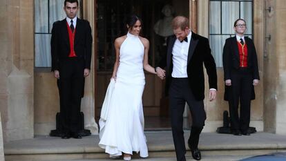 Lo que más llamó la atención del fugaz paso de la pareja hacia Frogmore House fue el cambio de modelo de Markle. La novia dejó boquiabiertos a muchos con su vestido de novia de la británica Clare Waight Keller, directora artística de la marca de moda francesa Givenchy, pero nadie imaginaba lo que vendría después. La ya Duquesa de Sussex reapareció con un vestido que destacaba toda su esencia, un única pieza con cuello halter, un corte que le encanta a Meghan y del mismo tono blanco inmaculado.