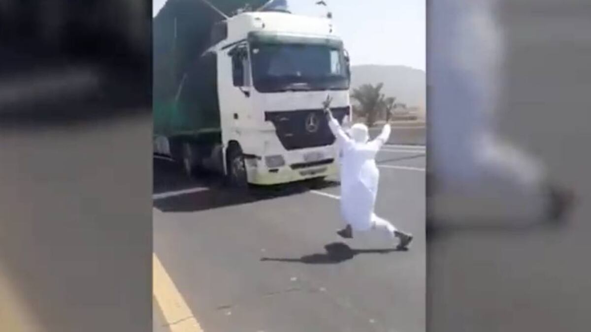 El baile de un adolescente de Arabia Saudita en una carretera nacional estuvo a punto de acabar en tragedia. El joven, aún no identificado, bromeaba sobre el techo de un automóvil situado en la cuneta de una autopista antes de saltar a la vía, colocándose delante de un camión en marcha que circulaba a gran velocidad. Al ver la escena, el conductor del camión comenzó a sonar el claxon y trató de esquivarlo desviándose ligeramente hacia su izquierda. Con tranquilidad, el joven logró evitar el impacto apartándose a un lado en el último momento. El vídeo ha sido filtrado en internet, generando miles de reacciones que piden la investigación del caso, así como la detención y el castigo de sus implicados.