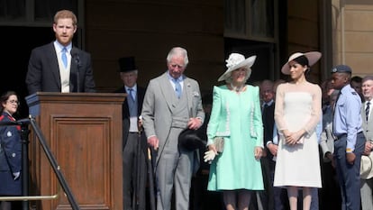 Tres días después de su boda, los recién casados Enrique de Inglaterra y Meghan Markle han vuelto al trabajo. El nuevo matrimonio ha participado en una fiesta organizada este martes en el jardín del Palacio de Buckingham para celebrar los 70 años del Patrocinio del Príncipe Carlos. Ha sido la primera cita en la que Meghan ha participado como miembro de la familia real. Para la ocasión, la nueva duquesa de Sussex llevaba un vestido de tubo de color nude con mangas de malla, junto con un sombrero de ala ancha, un estilo muy royal y lejos de otros conjuntos más informales a los que acostumbraba.